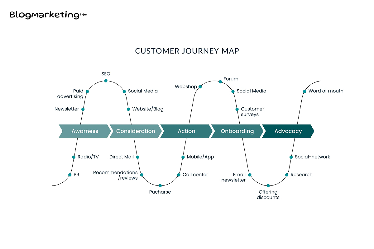 - Giai đoạn (Stages): Hành trình khách hàng thường được chia thành các giai đoạn khác nhau, tương ứng với các bước mà khách hàng trải qua khi tương tác với doanh nghiệp. Các giai đoạn này có thể khác nhau tùy thuộc vào loại hình kinh doanh và ngành nghề, nhưng phổ biến nhất là: Nhận thức, Cân nhắc, Quyết định, Trải nghiệm, và Duy trì.